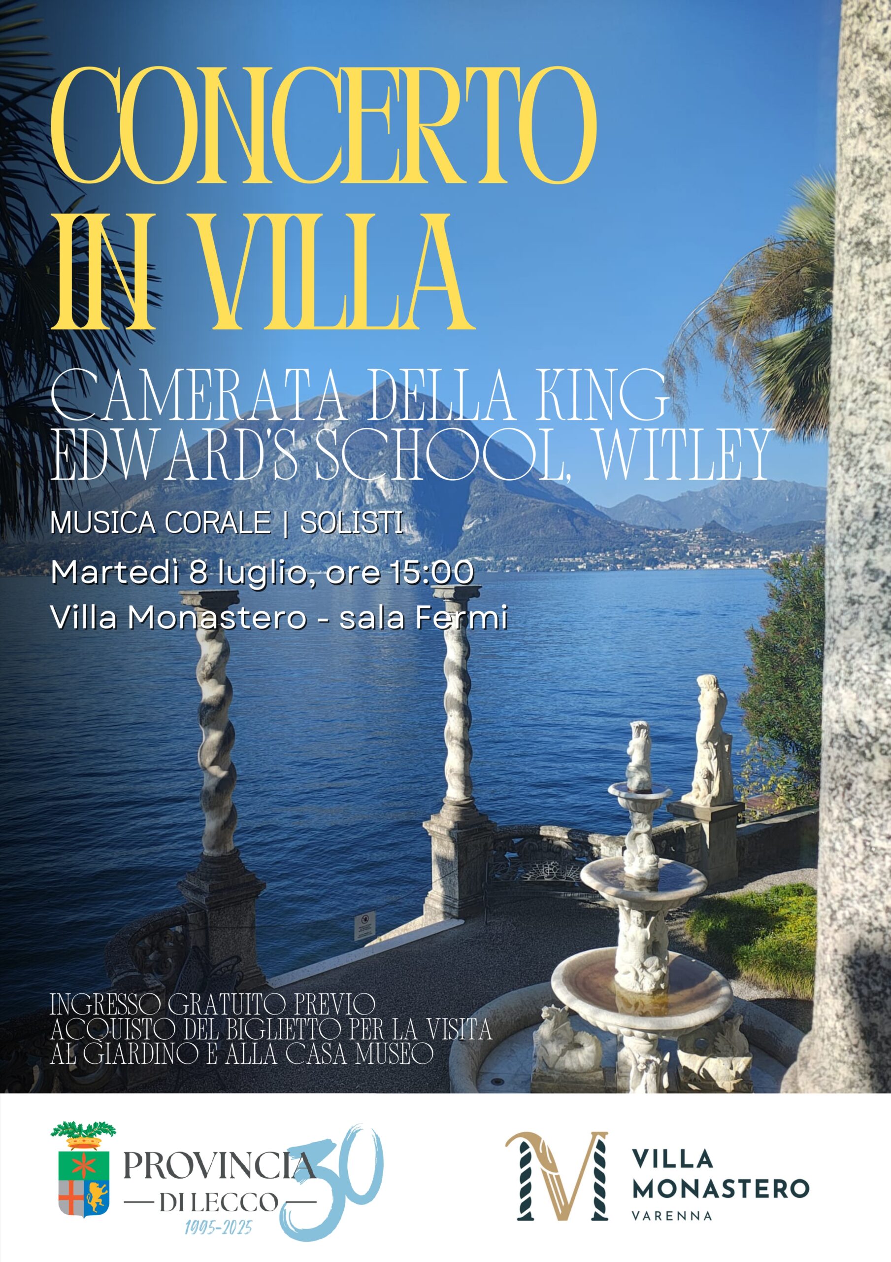 Martedì 8 luglio, alle 15.00, si terrà presso la Sala Fermi di Villa Monastero il concerto del coro della King Edward’s school Witlety