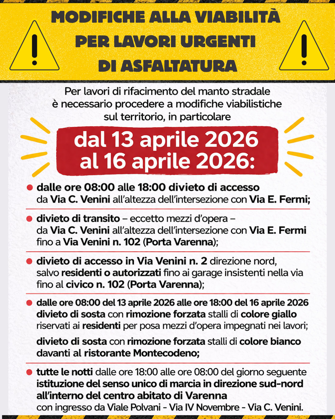 MODIFICHE ALLA VIABILITA’ PER LAVORI URGENTI DI ASFALTATURA